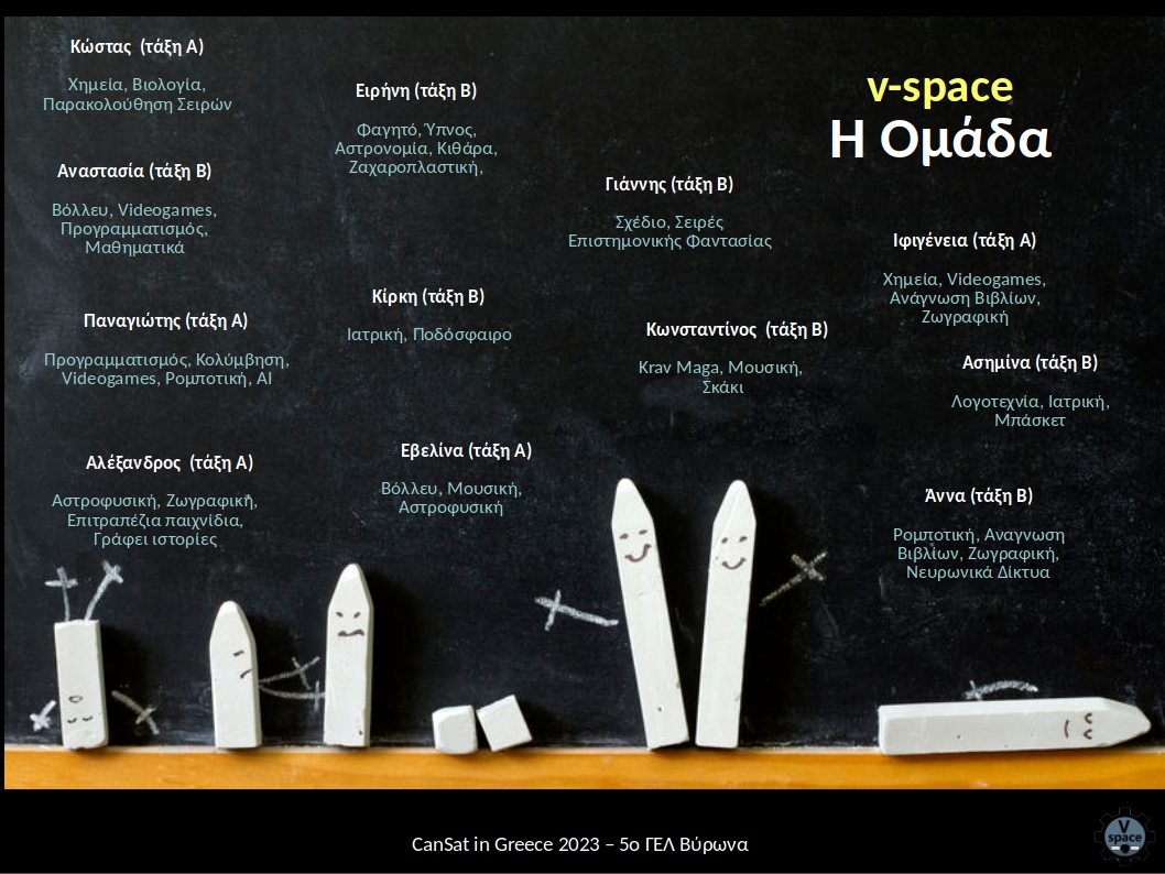 Η ομάδα V-SPACE αποτελείται από μέλη του σχολικού hackerspace του 5ου ΓΕΛ Βύρωνα. Είμαστε 12 μαθητές του 5ου και 3ου ΓΕΛ Βύρωνα με κάθε είδους ενδιαφέροντα.