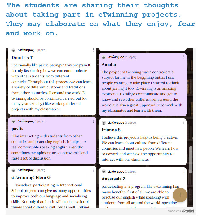 Οι αναρτήσεις τους έγιναν στο αντίστοιχο Padlet που έχει αναρτηθεί στην Ευρωπαϊκή Πλατφόρμα όπου οι μαθητές των σχολείων που συμμετέχουν στο πρόγραμμα ανταλλάζουν απόψεις.