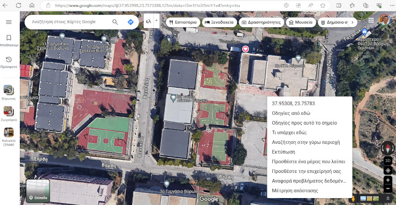 Στη συνέχεια με χρήση του Google maps οι μαθητές Βρήκαν τις συντεταγμένες του σχολείου.( Γ.Π: 37,95308 N, Γ.Μ: 23,75783 E)
