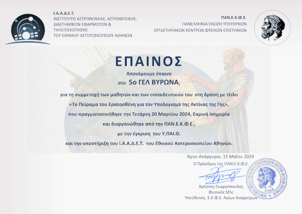 Τέλος υπολόγισαν την απόσταση του σχολείου από τον ισημερινό στα ΤΙ=4.220,2 km