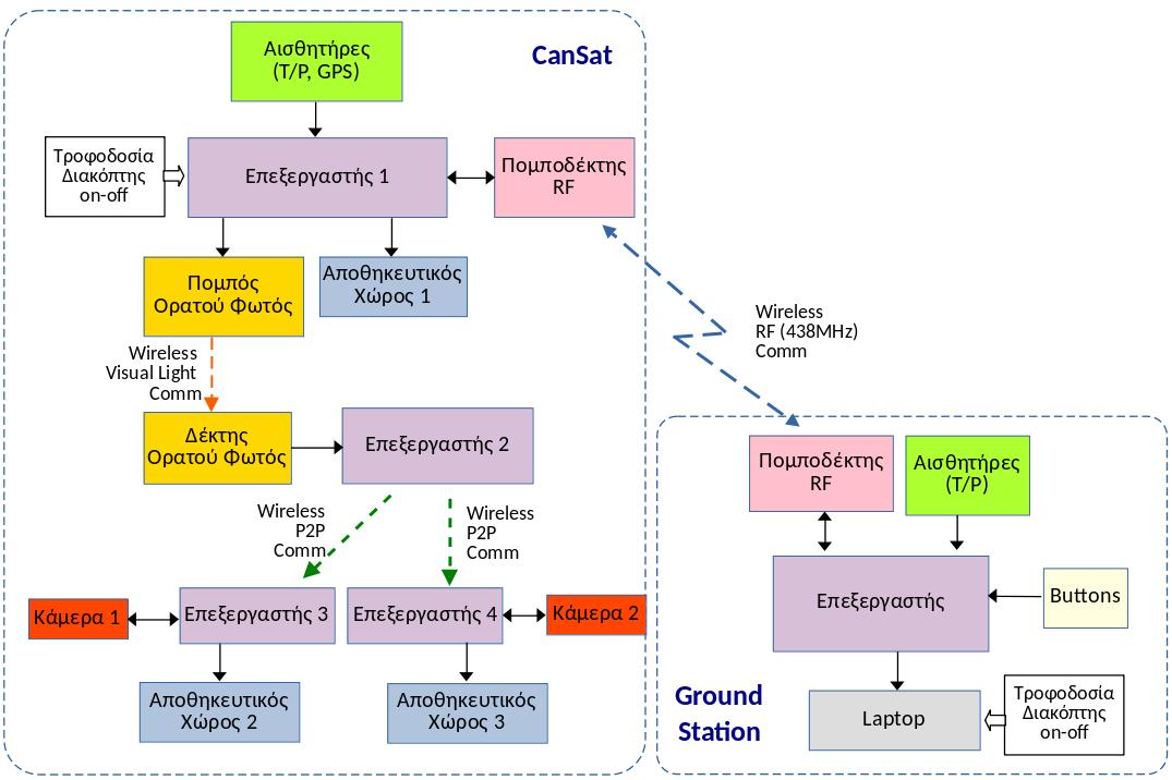 Στο CanSat μας θα υλοποιήσουμε το εξής: ο χειριστής από τον Επίγειο Σταθμό στέλνει εντολή μέσω ραδιοκυμάτων προς το CanSat, ώστε να ενεργοποιηθεί-απενεργοποιηθεί η 1η ή η 2η κάμερα. Ο κεντρικός επεξεργαστής λαμβάνει την εντολή κ την προωθεί στον 2ο επεξεργαστή ασύρματα χρησιμοποιώντας οπτικά κύματα.