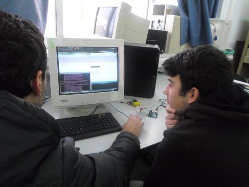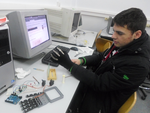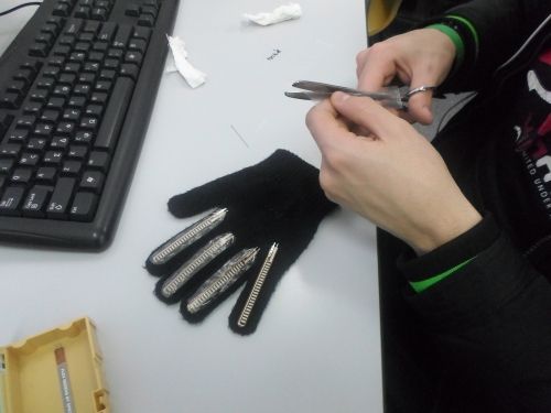 Ο Φοίβος εξασκείται στην τέχνη της ... υψηλής ραπτικής. Κι εκεί που παλεύει με τις κλωστές αναρωτιέται: να δοκιμάσουμε να σκάσουμε έναν πυκνωτή; Μη μας βάζεις ιδέες... Φοίβο! Η ιδέα πάντως άρεσε και στον Δημήτρη και στον Αντώνη Α. που δουλέψανε σήμερα μαζί του. Κατά τα άλλα, το ρομποτικό χέρι δεν είναι εύκολη δουλειά. Για να δούμε πως θα νιώσετε όταν σας προσκαλέσουμε να σφίξετε ένα ρομποτικό χέρι που θα ελέγχεται από ένα ανθρώπινο χέρι που δεν θα σας αγγίζει; Επιστημονική φαντασία; Περίπου...