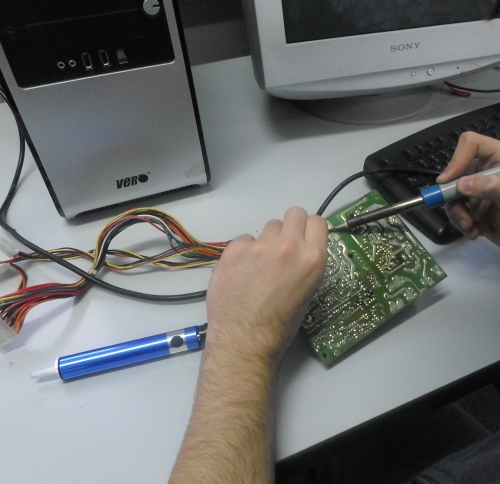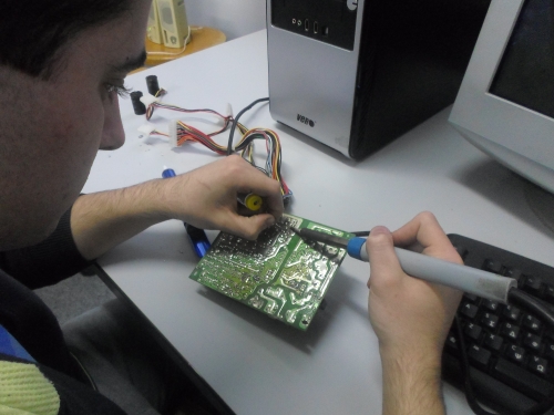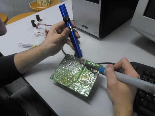 Ο Θανάσης, μοναχική φιγούρα σήμερα, ξεκολλούσε από μια πλακέτα αντιστάσεις, διόδους, πυκνωτές... με λίγα λόγια ό,τι έβρισκε μπροστά του! Φαίνεται δεν του πήγε καλά το διάβασμα αυτή την εβδομάδα.... Τουλάχιστον, ο σκοπός αγίασε τα μέσα: τώρα έχουμε ένα σωρό πράγμα για χρήση στο hackerspace! Thanks Θανάση!