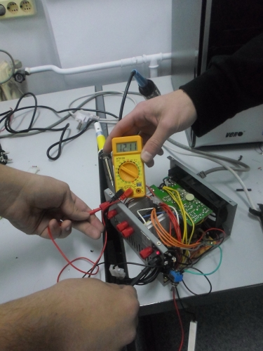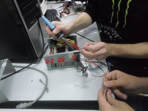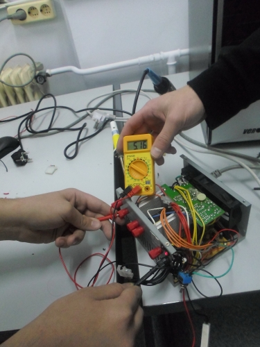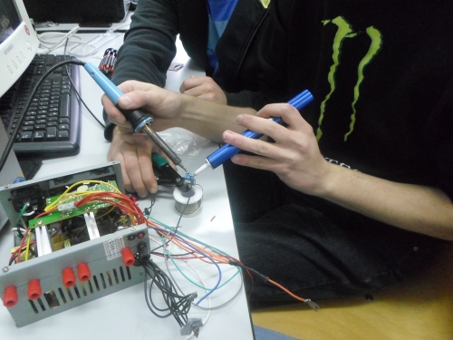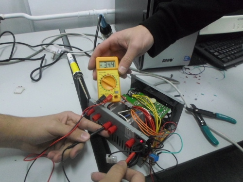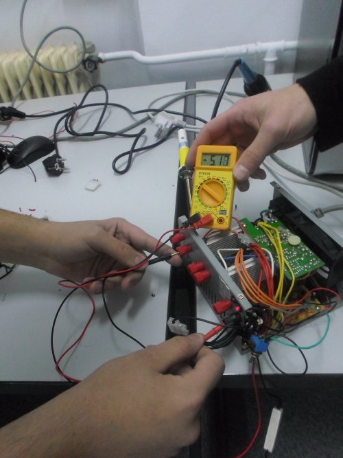 Ο Πέτρος κι ο Αντώνης Τ. ολοκληρώνουν (χειροκροτήστε) το τροφοδοτικό, αφού του προσθέσανε πέντε-έξι εξόδους, οι οποίες υποτίθεται έχουν να επιτελέσουν σοβαρές αποστολές: να προμηθεύσουν τον κόσμο με volt διαφόρων επιπέδων και κλάσεων... Τώρα, για ποιο λόγο το πολύμετρο έδειχνε -5Volt ... ε, η Φυσική είναι περίεργη επιστήμη!!
